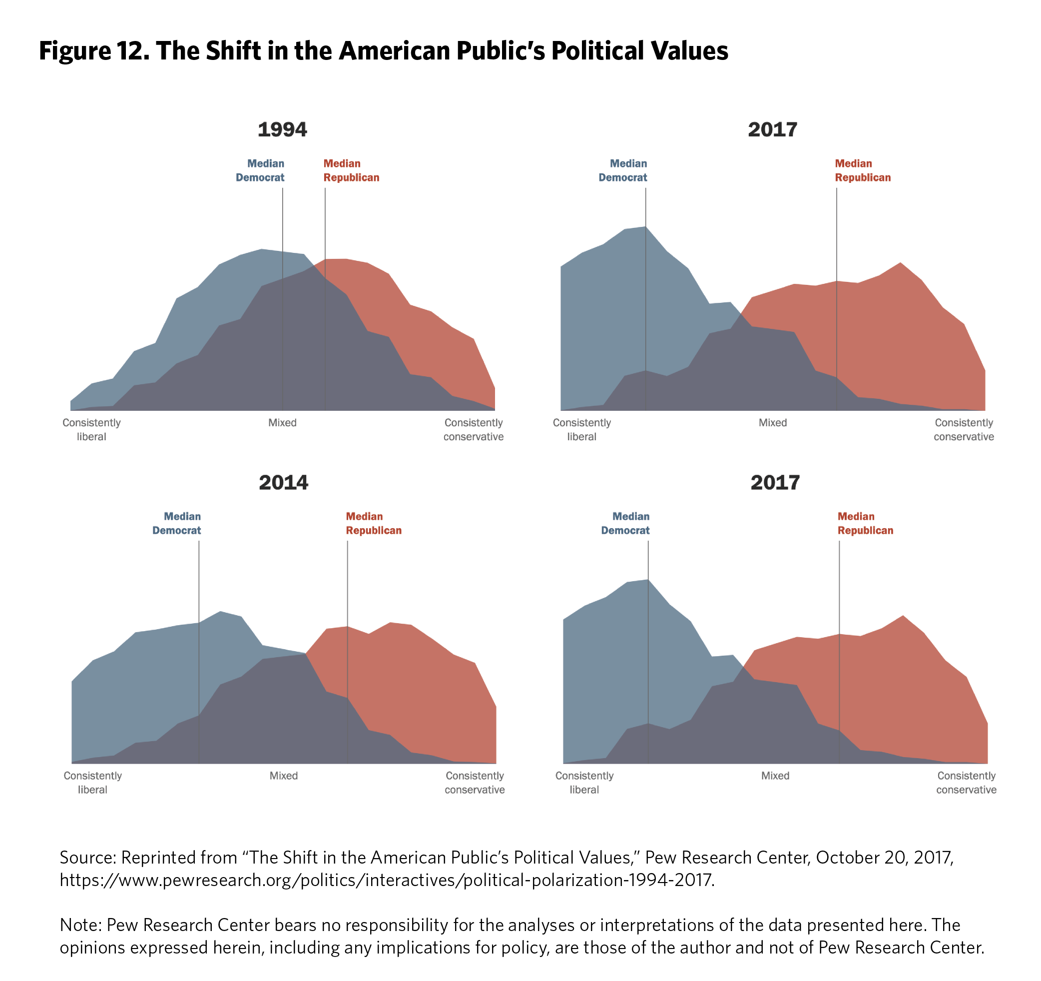 Findings on ordinary Americans’ polarization were disputed. Polarization among the public seemed to depend on what scholars were measuring. Pew Research Center found growing antipathy as well as ideological distance among political activists that was bleeding into regular voters, but it also found that a broad center still held.59